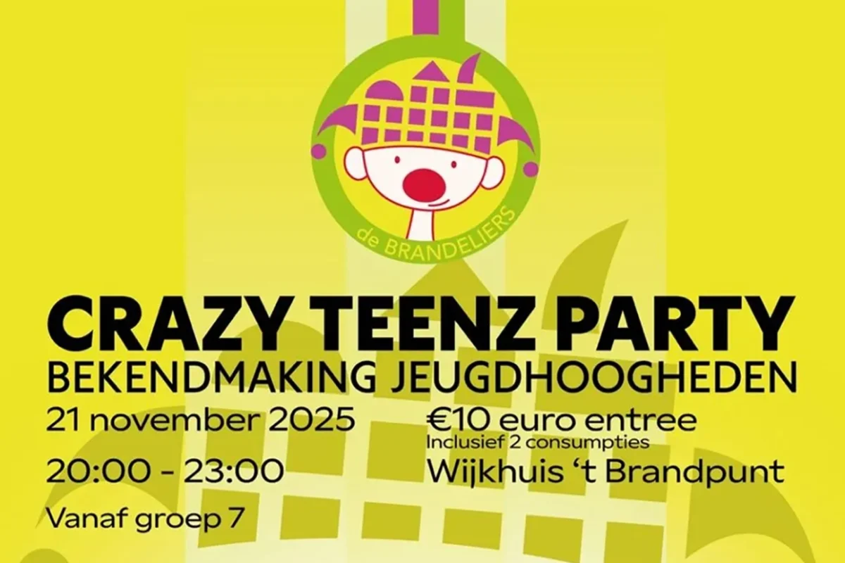 Op vrijdagavond 21 november 2025 organiseren De Brandeliers hét grootste tienerfeest ooit van Brandevoort. De Crazy TeenZ Party -de Neon Editie- is er voor ALLE tieners in de wijk. Dit mag je niet missen. Als klap op de vuurpijl maken zij de nieuwe Jeugdprins en Jeugdprinses bekend van aankomende carnaval. Ook wordt de nieuwe Jeugdraad gepresenteerd.